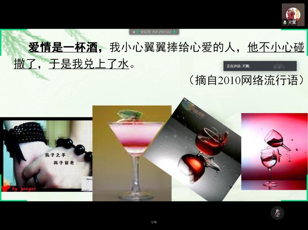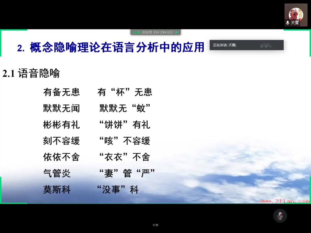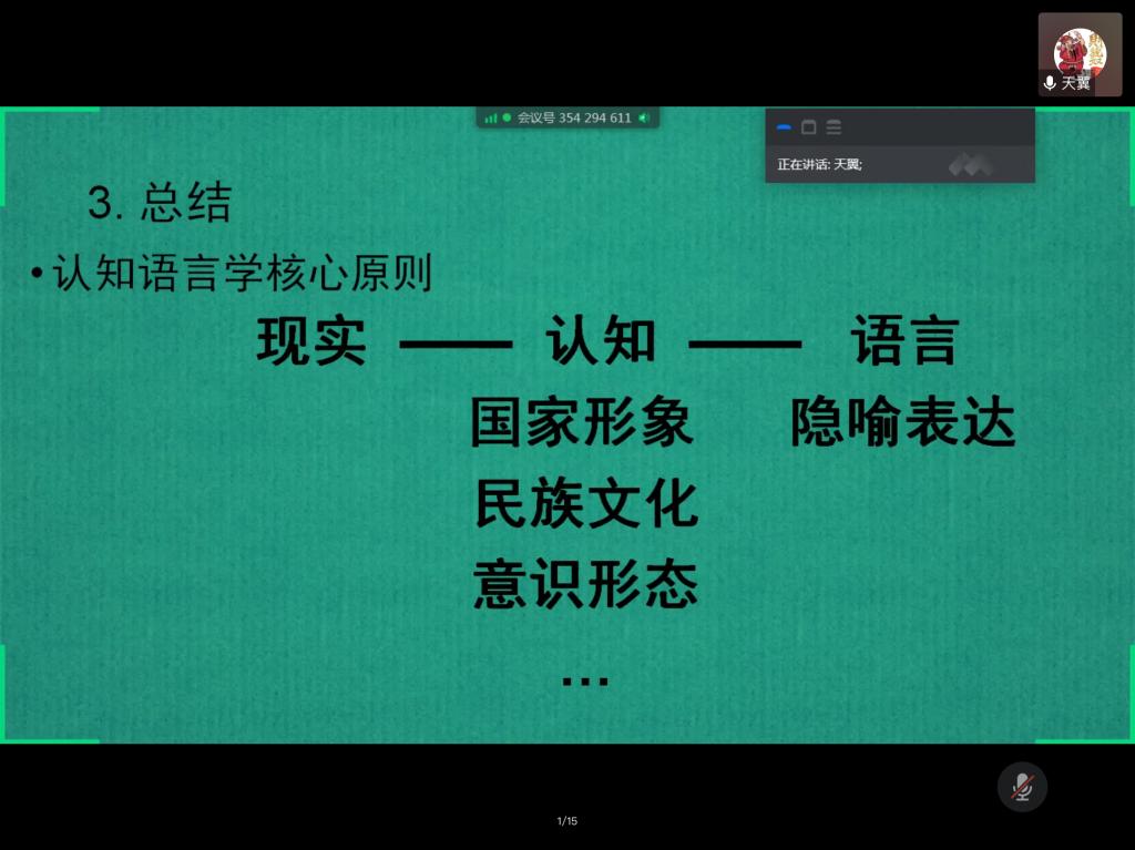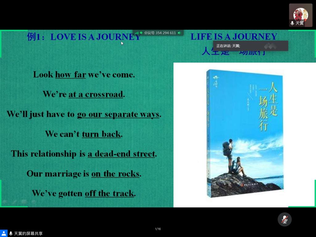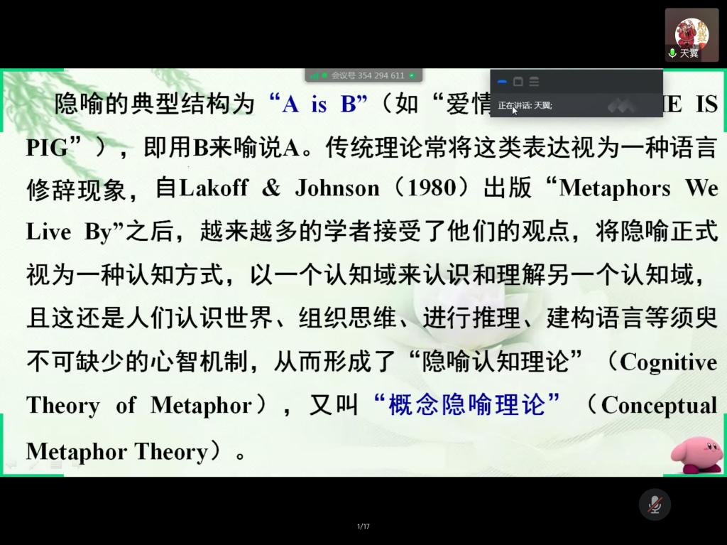 2020年5月29日19点整,K1体育王天翼教授在腾讯会议平台开展了一场题为《隐喻概念理论(ConceptualMetaphor Theory)》的专题讲座。本次讲座由黄慧老师主持,众多师生参与了此次讲座,反响热烈。