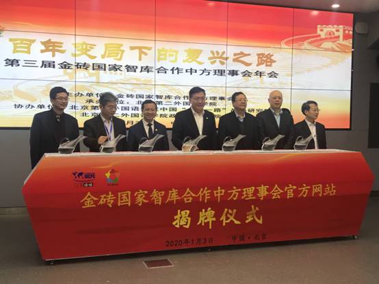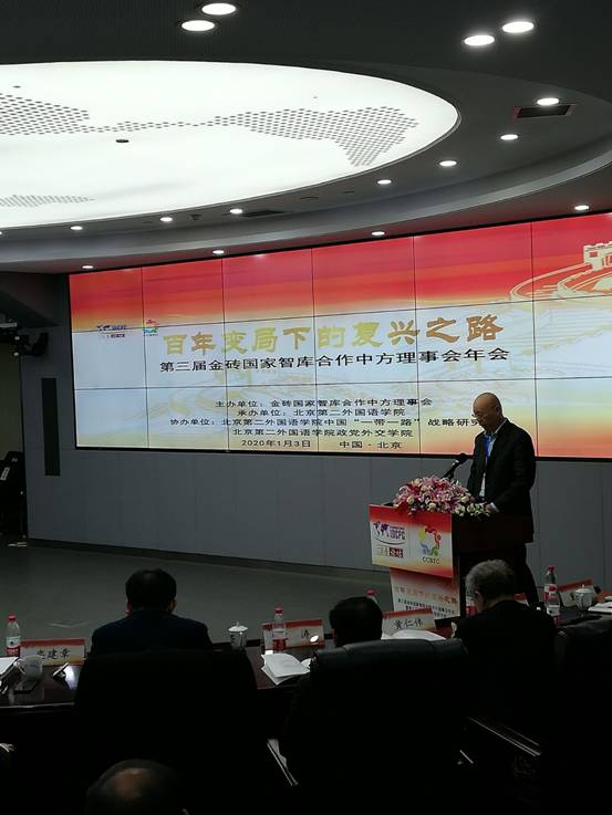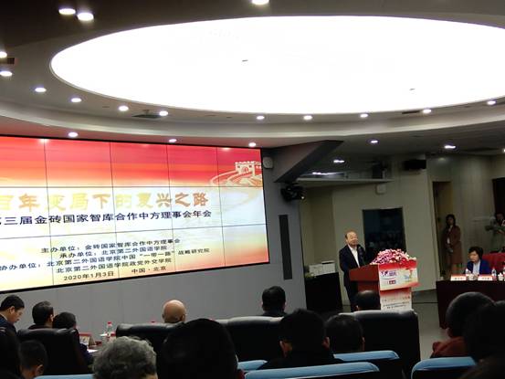 2020年1月3日,“第三届金砖国家智库合作中方理事会年会暨第二届万寿国际形势研讨会”在京召开。本次会议由金砖国家智库合作中方理事会主办、北京第二外国语公司承办。来自全国近百家理事单位的200多位专家学者围绕“百年变局下的复兴之路”的主题进行了热烈讨论。会议分别由中联部研究室主任、金砖国家智库合作中方理事会秘书长栾建章和中联部研究室副主任、金砖国家智库合作中方理事会副秘书长董卫华主持。