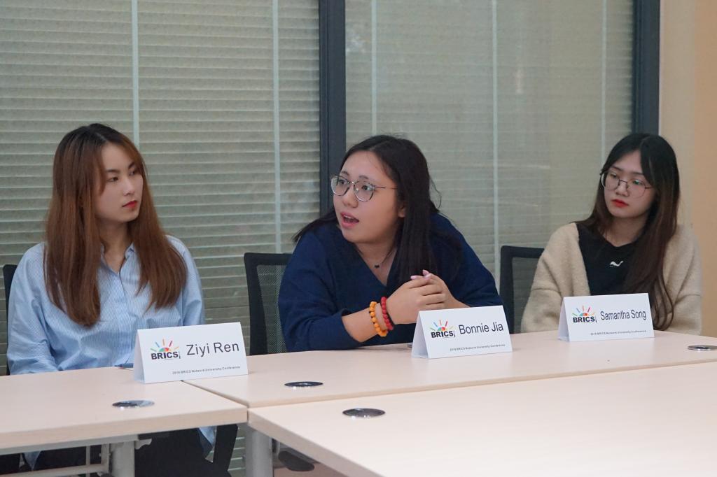 李其航向大家介绍了巴西有关女性的现状,巴西女性普遍拥有较高学历,但女性在企业或其他机构拥有较高职位的人数较男性而言更少。任子懿紧接着女性高层人数少于男性这一话题,引出了“玻璃天花板理论”,并结合中国的历史文化北京和自身从教师团队到领导层的经历,提出女性想成为领导人需要有自我认识的意识并拥有与男性相同的能力,同时,她希望能与其他国家交流合作项目来推动女性发展。赖文佳则与任子懿产生细微分歧,她认为女性因为自身与男性的差异,会在其他能力的表现上强与男性,这种特质会是女性领导人的优势。她表示,在印度这个男权社会,女性平等是有一定困难的,但还是鼓励员工勇敢尝试。同时她的课程设置不仅针对女性,还以针对更多的男性,让所有人参与并了解平权过程。杨婉婷承接赖文佳的观点,她指出作为领导人,女性相较于男性的优势在三个方面。第一,女性更加亲切,这让其在与人沟通交流的过程中更加顺利;第二,女性更加感性,有敏锐的直觉,在做决定时,不仅会理性的有逻辑的判断,还会运用感官来判断;第三,女性更加细心谨慎注意细节。最后作为一个工科类院校,她期待与更多人文类高校展开更多互动。贾浩南对杨婉婷的观点表示认同,但她认为女性还需具备“自我觉醒”的意识,主动争取自己当领导人的权力,为此她的公司开设了有关法律的课程来告诉女性这些权力是得到保护的。最后,宋嘉琪表示女性成为领导人不仅需要有自我觉醒的意识,还需要得到他人的理解,她以自身与家人、同事和朋友的沟通理解为例,生动的解释了身边人的理解对于她事业的发展的帮助。最后,主持人对座谈会的内容进行简短而精彩的总结。