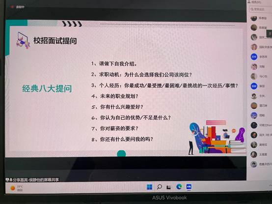 侯静怡女士在讲座正式开始之前,首先进行了一个有趣的破冰行动,让同学们改名,拉近距离。然后对她本人职业成长历程进行了分享,主要按照大学规划-清晰的规划-职场分享-树立目标解决这一路径展开。并从未来职业选择、了解职业调查报告、公司选择、晋升方向、兴趣、关注招聘、应届生重要身份、面试技巧等方面进行了详细分享,最后以HR的身份向同学们分享了一些职场和面试的经验,由点到面,由浅入深,让同学们受益匪浅。在分享结束之后,侯静怡女士就同学们日后将面临的择业问题表示今后将与同学们继续保持交流、沟通。