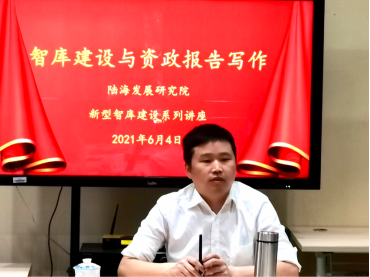 2021年6月4日,龙兴春教授受邀在博文楼实验室为研究院师生举行了主题为“智库建设与资政报告写作”的辅导讲座,陆海院新型智库建设系列活动正式开启。