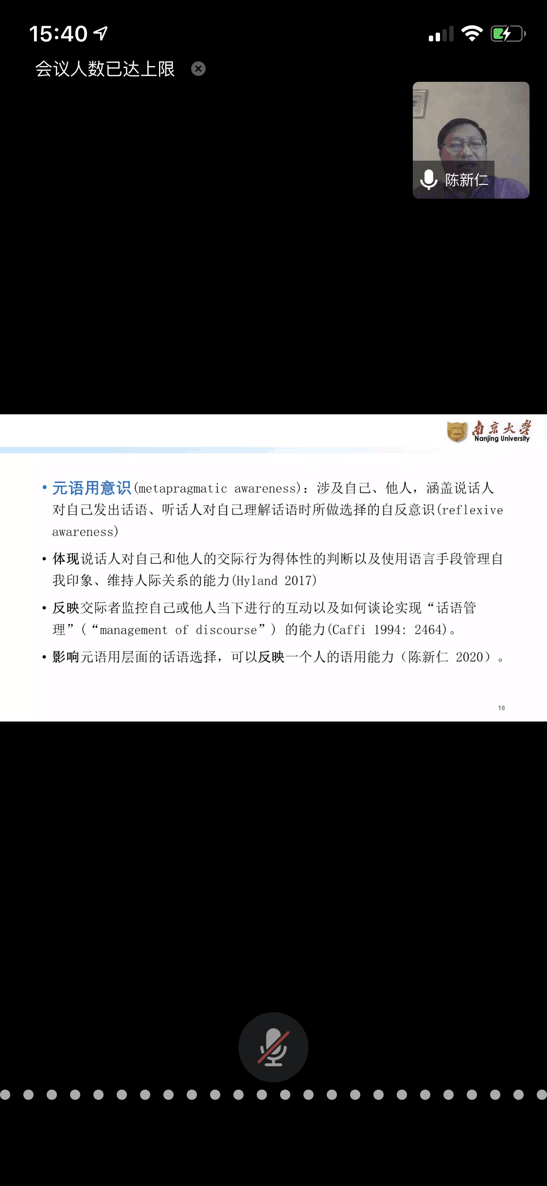 讲座之初,许梅花博士首先向大家简单介绍了陈教授及其在相关学术领域的贡献,并代表在线师生对陈教授的光临表示衷心感谢。接下来,陈教授从时下语言学研究的两大热点即交际者的动态身份选择与磋商、元话语的元语用研究出发,并结合相关的研究空白,谈及该报告的研究缘起。然后,陈教授对相关的理论研究背景如元话语、语用身份、元语用意识等进行了详细的回溯。在此基础上,陈教授率先提出“身份元话语”的概念,并对其定义、类型及表现方式进行了阐释。最后,陈教授以崔天凯大使接受美国记者访谈的资料为研究对象,指出了大使所使用的“身份元话语”,探究了崔天凯大使在应对刁难提问时如何藉此合理选择语用身份,质疑对方提问的得体性或有效性,管控受话人对其相关话语意义的解读,从而有礼有节地实现其外交目标。整场讲座严谨性与趣味性并存,互动交流热烈,师生意犹未尽。