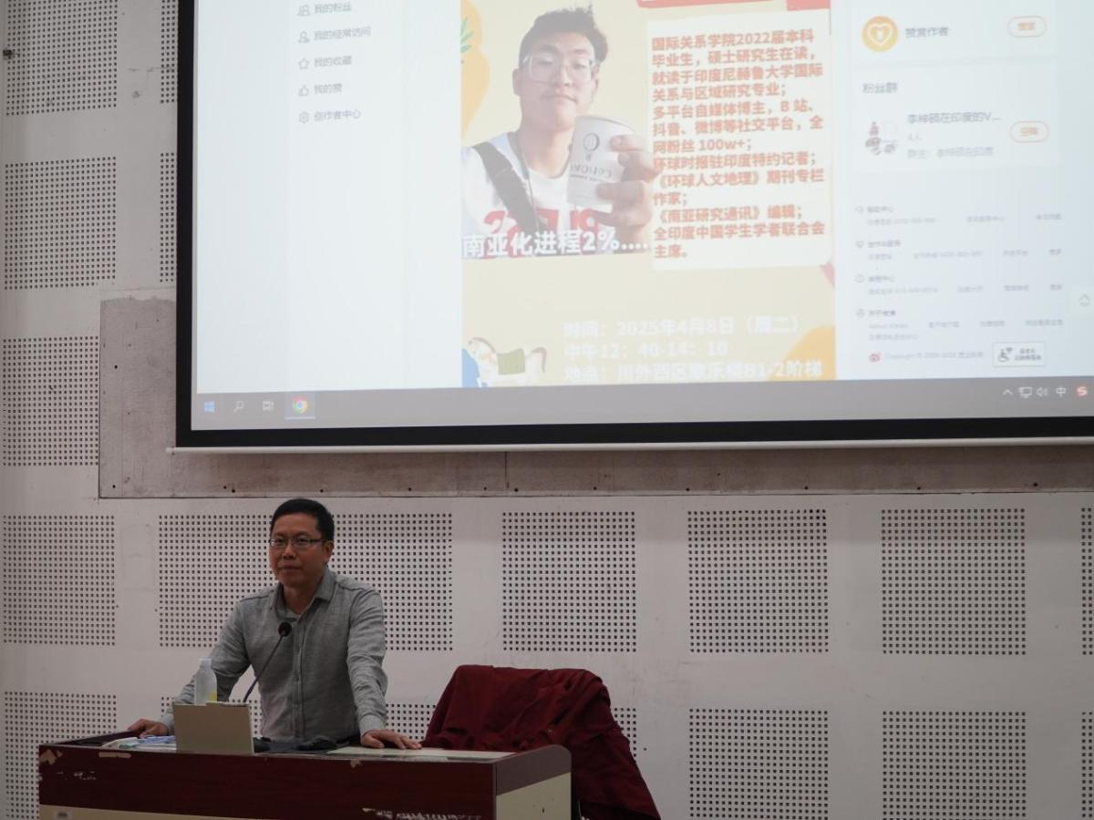 李梓硕学长首先回顾了自己从本科阶段的迷茫,到决定赴印度留学的心路历程。他坦言,自己的留学之路并非一帆风顺,也曾在考研与留学间反复权衡。最终,在龙兴春老师的指导下,与、他凭借自身对南亚事务的兴趣、对未来发展前景的判断以及对学术与现实资源的综合考量,毅然选择前往印度深造。