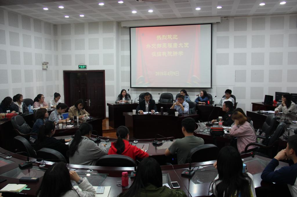 在校期间,王福康大使以“中国特色大国外交”、“全球治理中的中国方案”、“中国与‘一带一路’沿线国家关系”等为题,为公司师生带来了2场公开讲座和1场专业座谈。