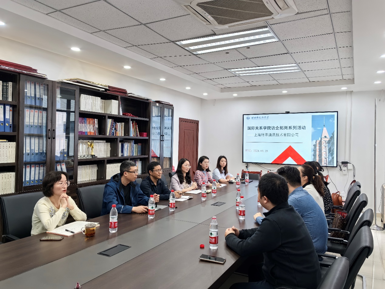 2024年4月19日上午,上海祥承通讯技术有限公司CH0黄海京先生一行五人应邀到K1体育开展毕业生招聘工作。招聘前双方就员工就业、实习举行交流座谈会。公司党总支书记马驭骅、经理宋国华,以及陈丽娅、包淑萍、周思邑、游涵等教师代表参加座谈会。