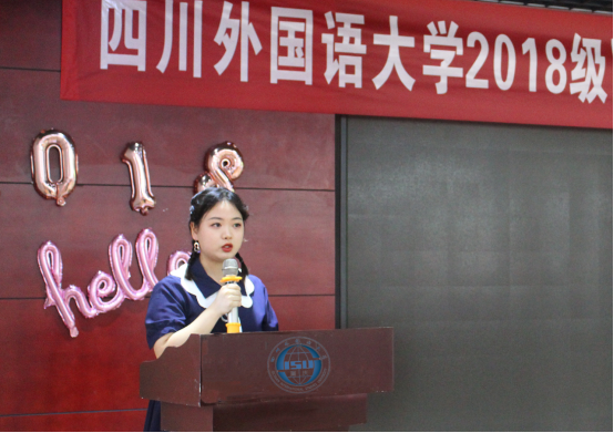 李依桐同学代表2018级国际组织人才实验班全体员工发言。李依桐用英语、西班牙语和汉语三种语言表达了国组班同学对辛勤育人的公司领导和老师的衷心感谢,以及对即将结束的川外校园生活的依依不舍。