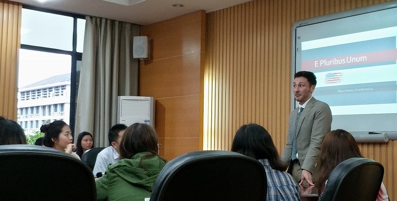 2018年4月26日晚上7:00在西区教学楼A204会议室,K1体育成功举行了2017-2018年度区域与国别研究论文大赛系列讲座的第五场美国研究专场。此次讲座由陈广猛老师主持,外教Christopher Crachiola(Chris)主讲,前来参加讲座的有谌华侨老师、李海英老师、姚兰老师、葛静静老师,纵横学社的成员以及全校对美国研究感兴趣的同学。