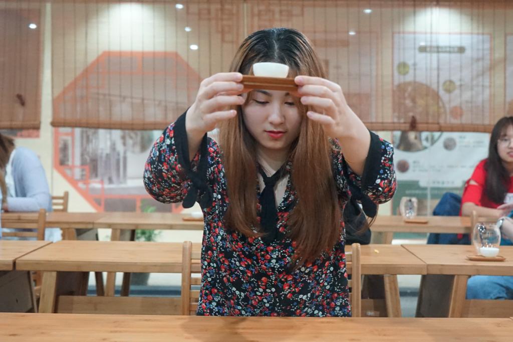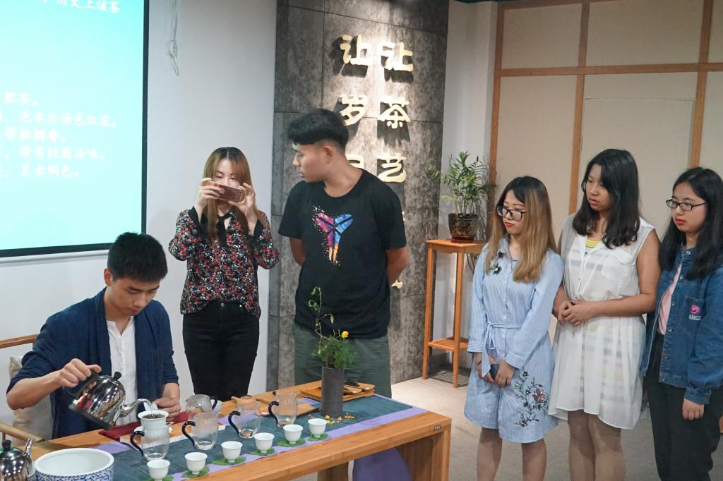最后,是最精彩的茶艺体验活动。老师沏茶,请同学们品尝不同种类的茶叶的味道,有白茶白牡丹,青茶铁观音和红茶正山小种。的确,像老师所说,不同种类的茶有不同的韵味,而盛过茶水的杯子也留下淡淡的清香。在课程的最后阶段,老师和同学们进行了亲切的交流,并合影留念。至此,此次活动圆满结束。
