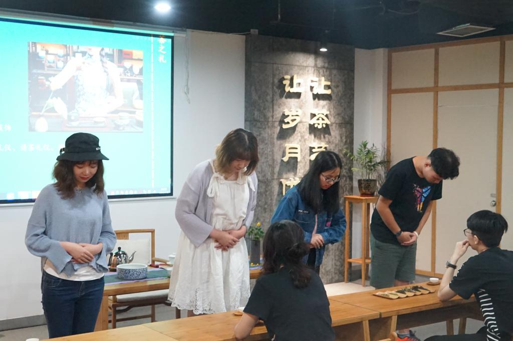 首先老师告诉我们,中国是世界上最早种植和利用茶的国家,包括云贵川在内的西南地区饮茶的文化更是来历已久。传说,神农尝百草,一日遇七十二毒,得茶而解,所以茶起先是用来解毒治病的,后来人们才慢慢的发现茶的食用和饮用价值。早在公元前一千年左右,中国人就开始用茶了;后来发展到唐代,人们讲究煎茶,但多在上层社会中享用,百姓难以享受到饮茶的乐趣;而宋代讲究点茶,注重汤色和汤花,普通老百姓也普遍喝茶了。而后,老师又从站姿,坐姿,穿着服饰,奉茶、请茶、谢茶礼仪进行茶之礼的演示,同学们也跟随着老师的演示进行模仿。这一环节既有趣,又传授了十分实用的饮茶之礼。