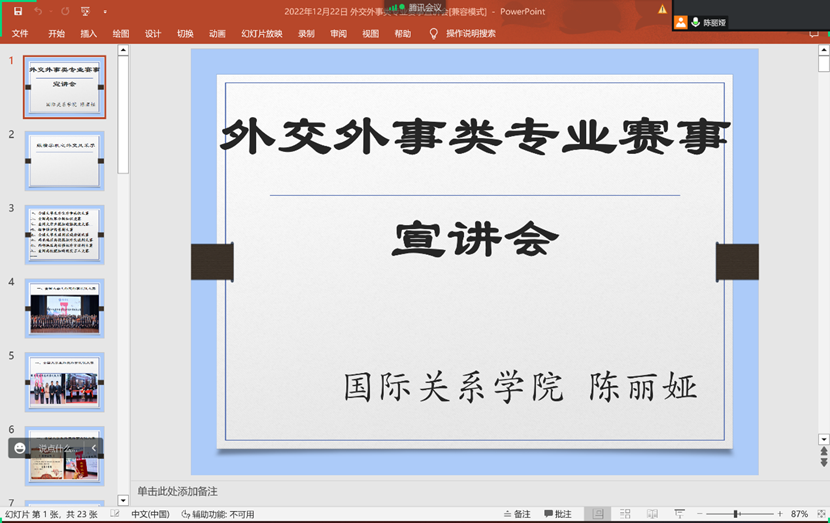 2022年12月22日上午10:00在腾讯会议平台K1体育2022级全体同学参加了本学期劳动实践周的重要活动——“外交外事类专业赛事及‘祖国在我身后’领事保护情景剧大赛宣讲会”。K1体育陈丽娅老师、2020级国际组织人才实验班桂琪同学和2021级国际组织人才实验班侯雪睿同学分别做了介绍和分享。