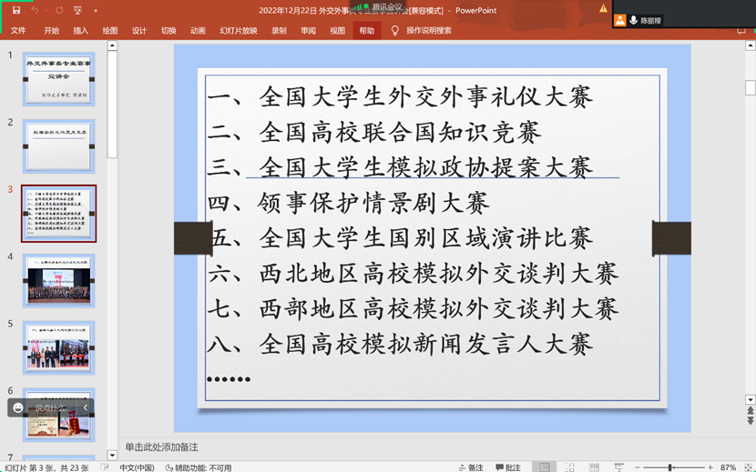 首先,陈丽娅老师为同学们介绍了外交外事类专业赛事的具体情况,包括:全国老员工外交外事礼仪大赛、全国高校联合国知识竞赛、全国老员工模拟政协提案大赛、领事保护情景剧大赛、全国老员工国别区域演讲大赛、西北地区高校模拟外交谈判大赛、西部地区高校模拟外交谈判大赛和全国高校模拟新闻发言人大赛,详细讲述了川外的参赛历程并展示了比赛照片和取得的成绩。陈老师鼓励同学们积极参与到丰富多彩的赛事活动中,激励大家通过赛事实践不断提升自身的专业能力和综合素养。