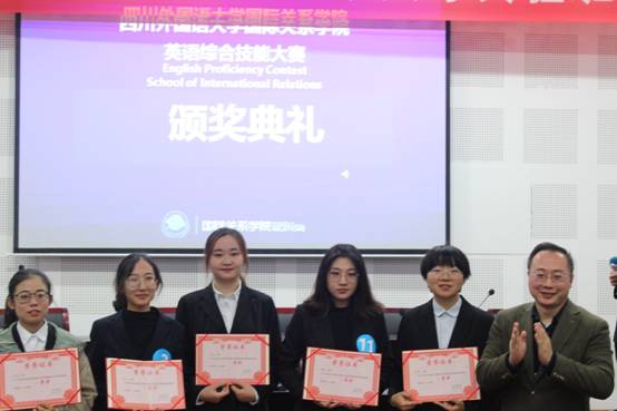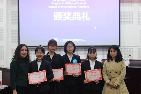 最后,孙钟帅、方其燕两位同学获得定题演讲比赛一等奖,陈河润、李依桐、周彧涵、吴诗蕊同学获得二等奖,胡瑾、吴比、王双、刘皓、胡淼、郭忠扬同学获得三等奖。王双同学获得口译比赛一等奖,陈河润、杨芃同学获得二等奖,李依桐、徐彦僖、陈文虎、姚彤阳同学获得三等奖。