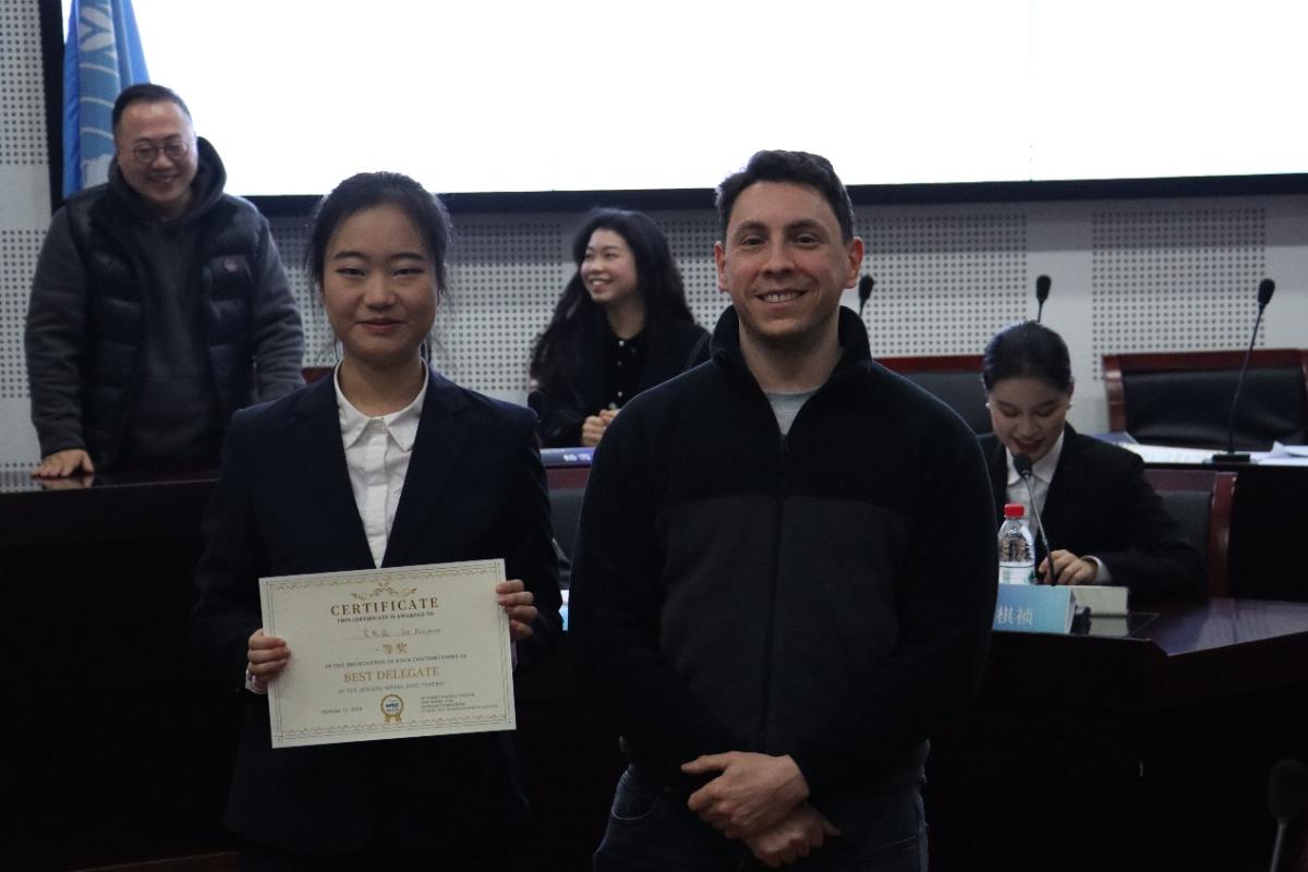 比赛结束后评委张国玺老师、Levin Erez老师及杨雪滢学姐进行了专业点评,肯定亮点、指出不足并给出建议,并颁发了奖项。菲律宾代表吴牧遥同学凭借出色表现、深刻见解及卓越谈判技巧,在众多选手中脱颖而出,荣获一等奖;印度尼西亚代表张馨月同学、新加坡代表李玥妍同学表现优异,在对议题探讨、合作推动等方面表现突出,同获二等奖;越南代表尹乙力同学、泰国代表冉鑫洋同学、秘鲁代表蒋春熙同学在比赛中积极参与、据理力争,为各自经济体争取利益同时展现良好团队协作,荣获三等奖;日本代表孙培瑶同学提出极具创新性与可行性的提案,为推动更加包容的合作之路贡献智慧,斩获最佳提案奖。